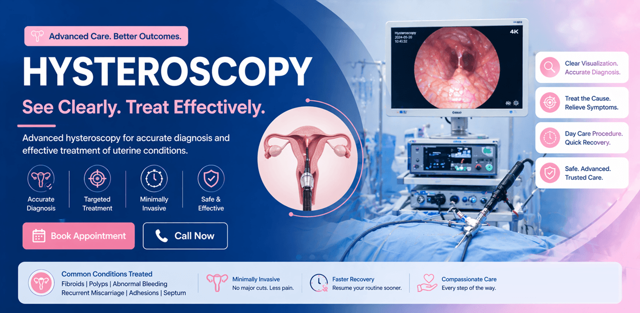 Hysteroscopy is a minimally invasive gynecological procedure that allows a doctor to examine the inside of the uterus using a thin, lighted instrument called a hysteroscope. It is inserted through the vagina and cervix, eliminating the need for cuts or stitches.